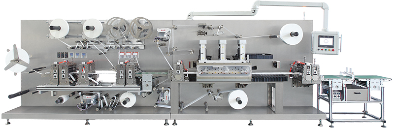 该机是由我公司科研团队精心研发,专为敷料贴的生产成型与包装流程一体化而设计。整机采用先进的人机界面和运动控制器程序控制技术,各传动组件均由伺服电机进行独立驱动,共计十四个高精度伺服电机。通过滚刀滚切技术实现产品的一次性成型,后端则采用往复式热封机构进行热封包装,确保封口部分平整、牢固且外观美观。设备运行流畅稳定,操作便捷,是敷料贴生产与包装一体化作业的优选设备。